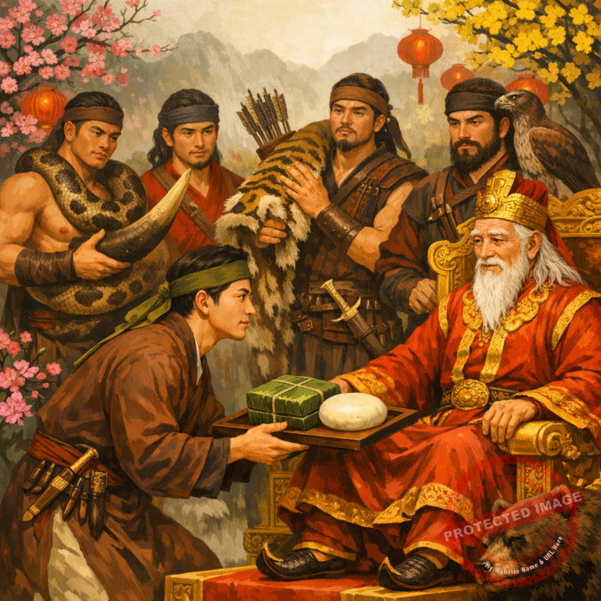 Thời Hùng Vương thứ sáu (1712 – 1632 trước Tây lịch), nhà Vua công bố sẽ truyền ngôi cho người con nào có phẩm vật quý nhất dâng cúng tổ tiên vào dịp Tết. Các hoàng tử đua nhau tìm của ngon vật lạ khắp rừng sâu, biển rộng đem về dâng Vua. Chỉ riêng Lang Liêu, theo lời Thần chỉ dạy, dâng lên bánh giầy (hình tròn) tượng trưng cho trời và bánh chưng (hình vuông), làm từ gạo nếp, có nhân, thịt heo, tượng trưng cho đất – thể hiện lòng biết ơn trời đất, tổ tiên và cha mẹ. Chính ý nghĩa sâu sắc này, và nhất là được Thần phù trợ, đã khiến Vua truyền ngôi cho Lang Liêu.