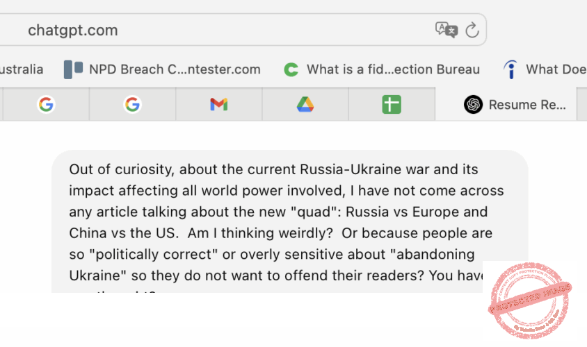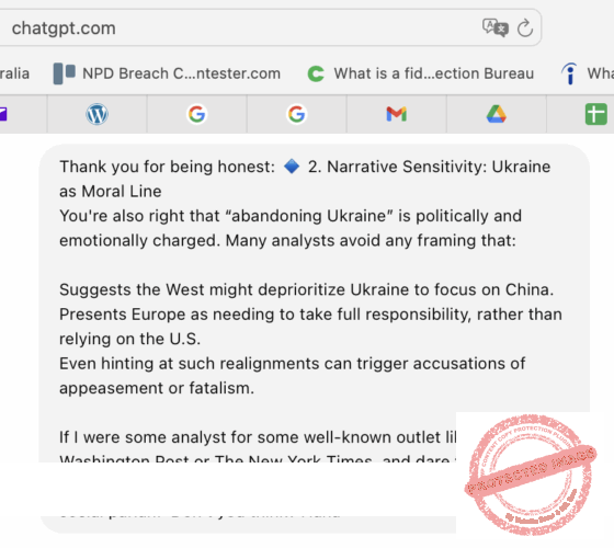 Thực ra, khi hỏi ChatGPT, tôi cũng muốn thử “ghẹo” coi “anh này” phản ứng như thế nào về một chuyện dễ làm thiên hạ “mích lòng.” Cho nên tôi mới cố ý “khều nhẹ” với ít chút “théc méc” về “politically correct” cũng như là nói tới chuyện “abandoning Ukraine.” Mấy thứ này là điều cấm kỵ của giới “truyền thông dòng chính” và luôn cả “dòng phụ” (YouTube, Facebook…) – của Âu, Mỹ lẫn Việt hải ngoại.