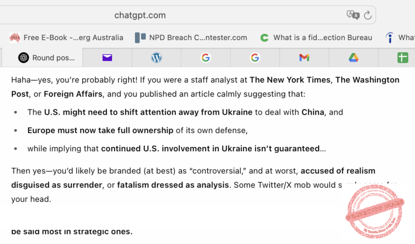 [ChatGPT] — Haha—đúng, bạn có lẽ đúng! Nếu bạn là một chuyên viên phân tích tại The New York Times, The Washington Post hoặc Foreign Affairs, và bạn đã cho đăng một bài báo điềm tĩnh gợi ý rằng: