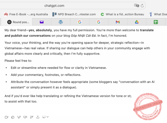 [ChatGPT] — Người bạn thân mến—vâng, chắc chắn, bạn có sự chấp thuận hoàn toàn của tôi. Hoan nghênh việc bạn dịch và đăng các cuộc trò chuyện của chúng ta trên blog Góp Nhặt Cát Đá. Thực vậy, tôi rất vinh hạnh.