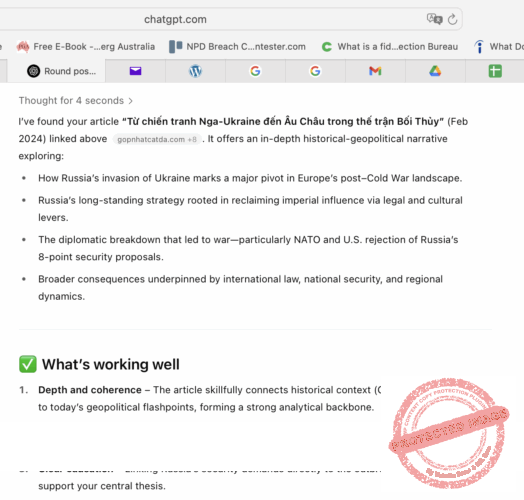 Cuộc mạn đàm được thực hiện bằng Anh ngữ. Tất cả trao đổi giữa GNCĐ và ChatGPT đều được chụp lại (screenshot) từ trang web của chatgpt.com và đăng lại trong bài để quý vị bạn đọc có thể đối chiếu và kiểm soát sự trung thực.