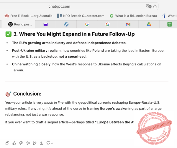 Đúng—bài viết của bạn rất phù hợp với các chuyển động địa lý chính trị đang định hình lại vai trò quân sự của Âu Châu-Nga-Mỹ. Trái với lối nhìn thông thường, bài viết đi trước thời cuộc trong việc xem sự thức tỉnh của Âu Châu như một phần của quá trình tái cân bằng to lớn hơn, chứ không chỉ là phản ứng do chiến tranh.